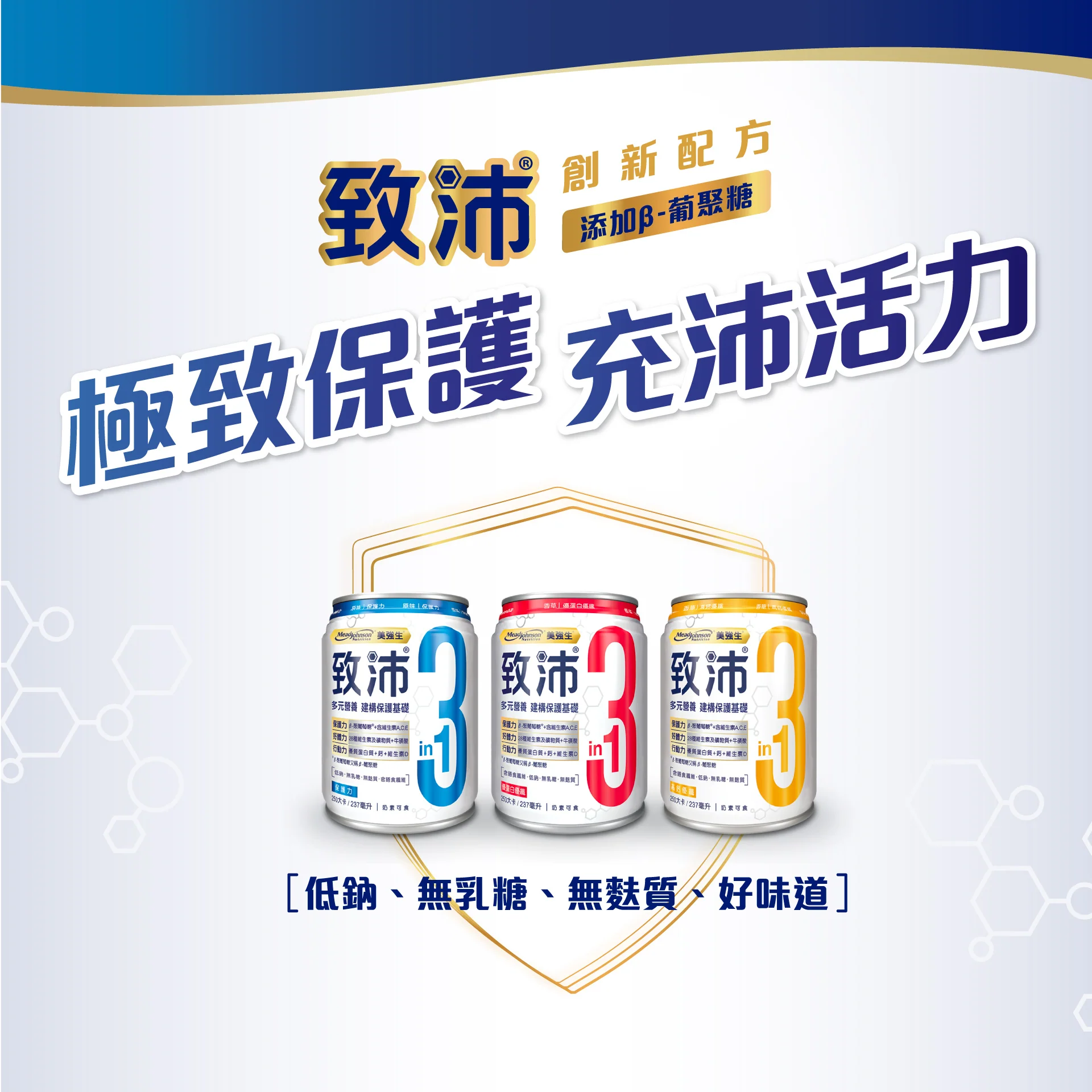 致沛三合一多元營養飲,每日攝取可獲得優質營養,提升保護力,調節生理機能維持健康