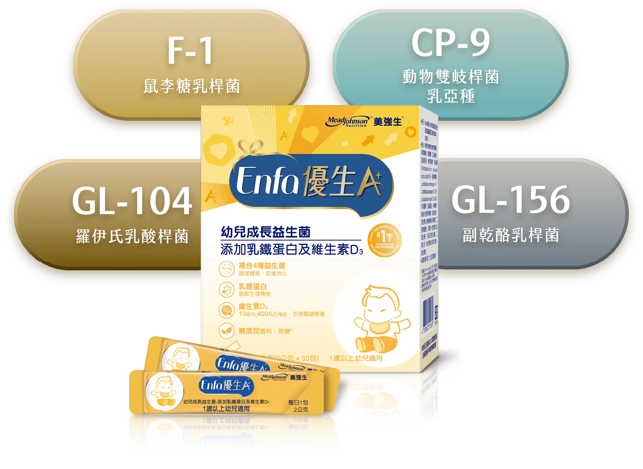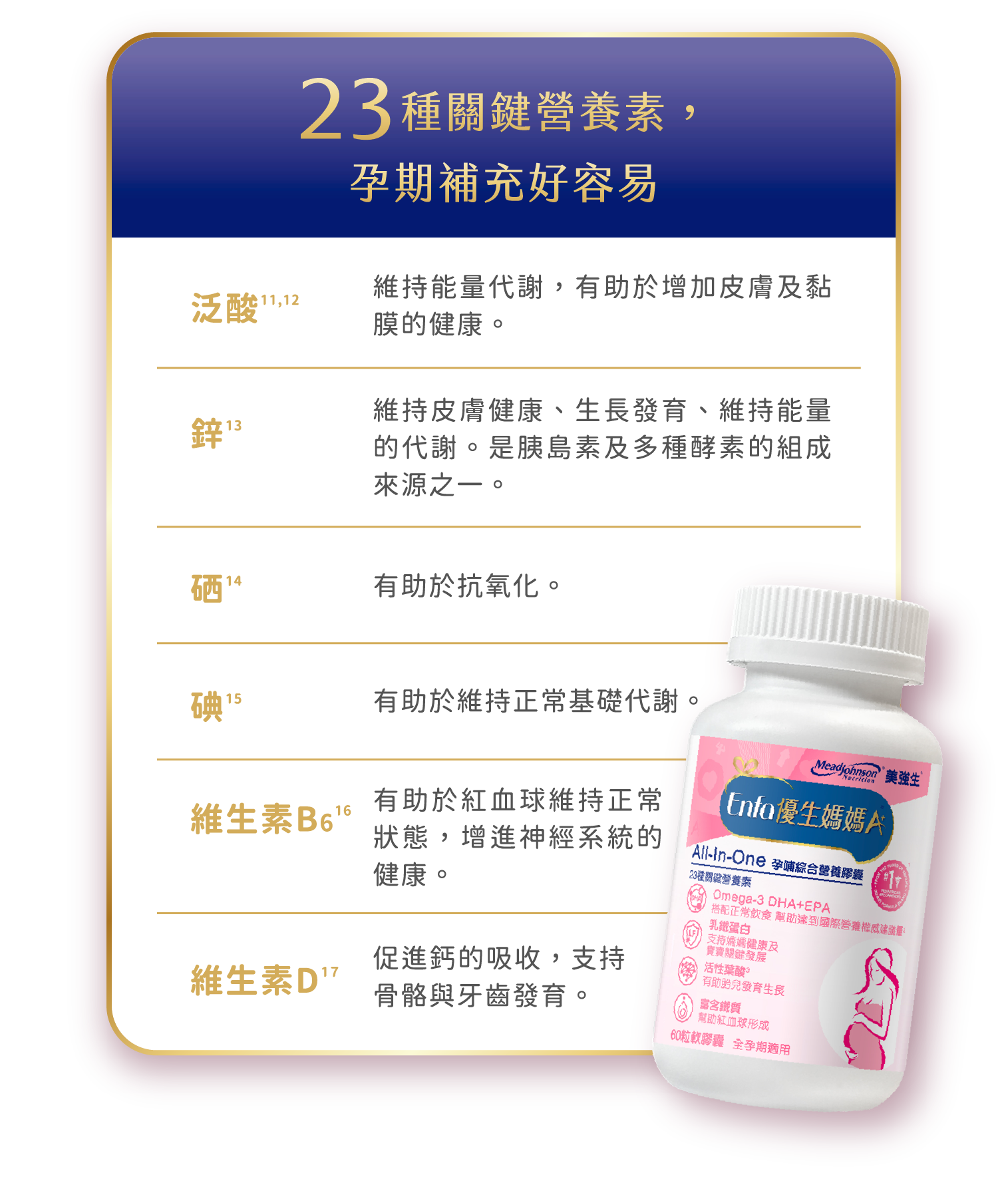 美強生期待與您走過從胎兒到幼兒的發展,以專業營養守護每個珍貴成長的瞬間,幫助媽媽一同與寶寶健康發展。全新推出Enfa 優生A+母嬰保健系列產品,提供孕哺嬰兒營養。Enfa 優生媽媽A+孕補綜合營養膠囊含乳鐵蛋白、鐵、葉酸、DHA等23種關鍵營養素,其中乳鐵蛋白可以調整體質、增強體力,有助於孕哺乳媽媽的健康維持,DHA 是胎兒發育的關鍵脂肪酸,活性葉酸一份達535微克,有助胎兒成長、核酸與核蛋白的發展,活性甘胺酸亞鐵可顯著提高鐵的吸收率並降低刺激感,還有泛酸、鋅、碘、硒、維生素,幫助身體代謝、抗氧化、增進皮膚健康等。早晚各一粒,幫助補充孕早、中、晚期關鍵營養素。成為美強生金星會員享有豐富的課程、產品體驗大禮包與點數獎勵方案。