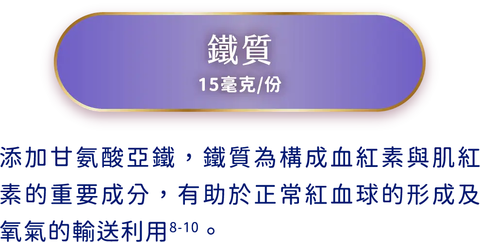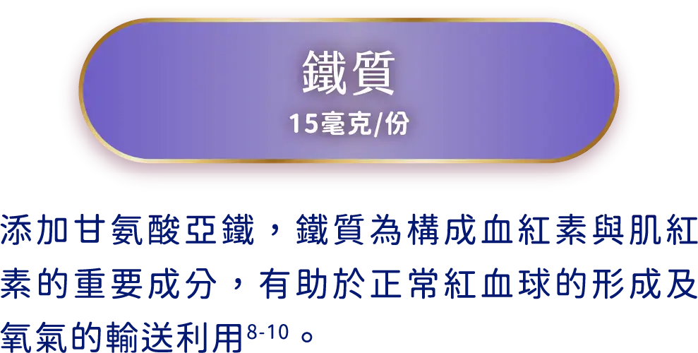 鐵質每份達15微克 添加甘胺酸亞鐵,吸收利用率為一般鐵的3.7倍