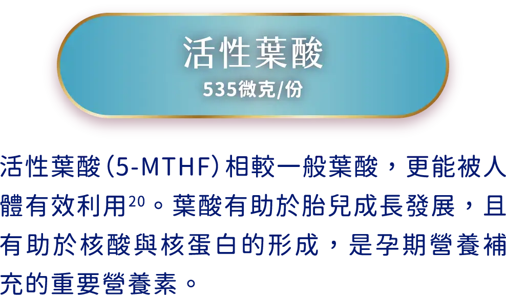 活性葉酸每份達535微克,有助胎兒成長、核酸與核蛋白的發展
